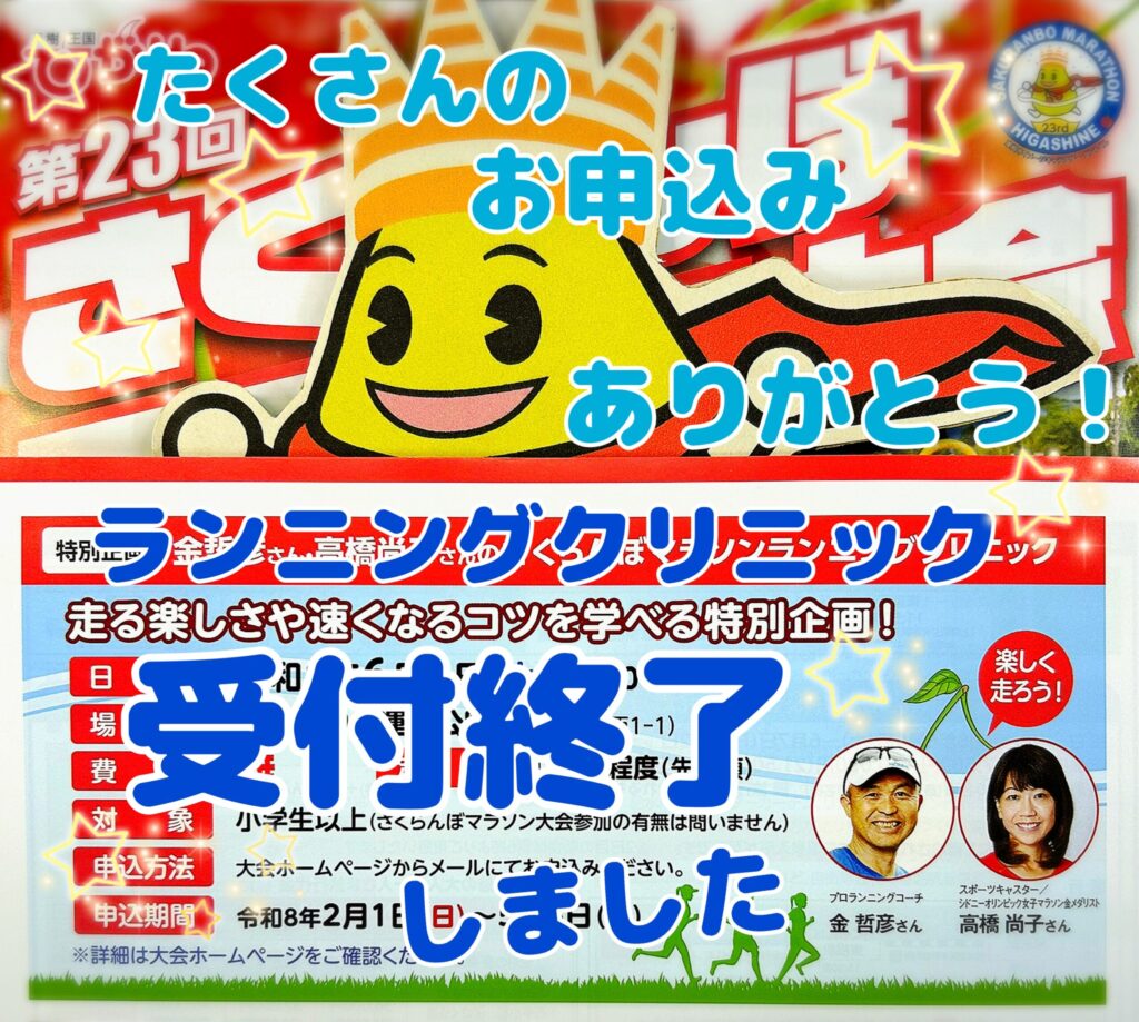 こんにちは、ひがしねさくらんぼマラソン大会事務局です。